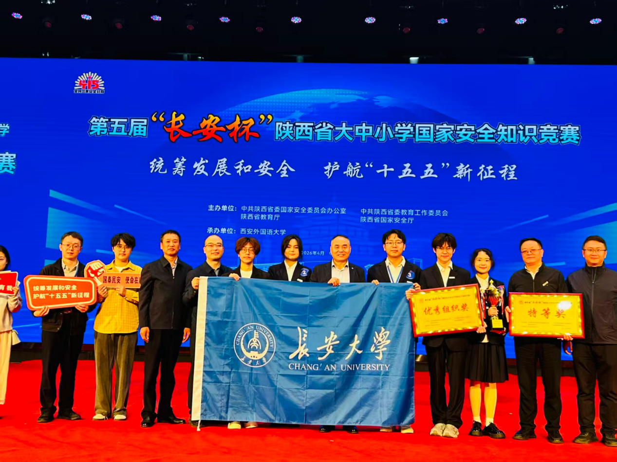 2026年4月13日,由中共陕西省委国家安全委员会办公室、中共陕西省委教育工作委员会、陕西省教育厅、陕西省国家安全厅联合举办的第五届 "长安杯" 陕西省大中小学国家安全知识竞赛(高校组)决赛在西安外国语大学长安校区圆满落幕。经过激烈角逐,我校代表队凭借扎实的知识储备、出色的临场应变和默契的团队协作,从全省9支晋级决赛的高校代表队中脱颖而出,荣获特等奖,学校荣获优秀组织奖,梁俊辉同学荣获最佳选手荣誉称号。